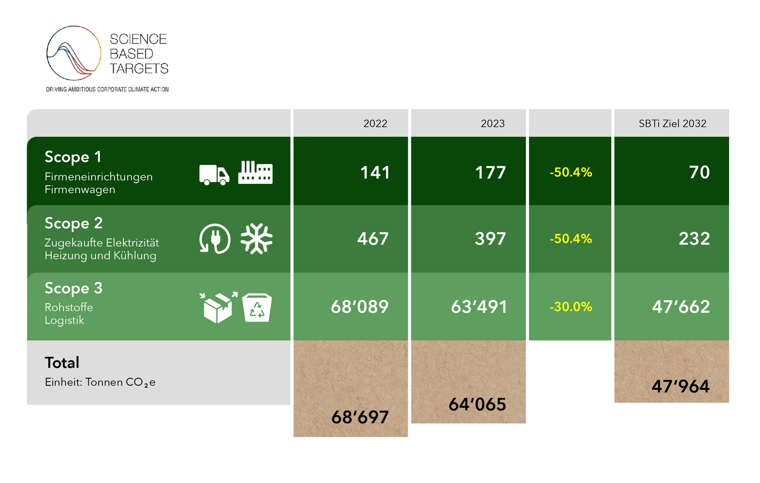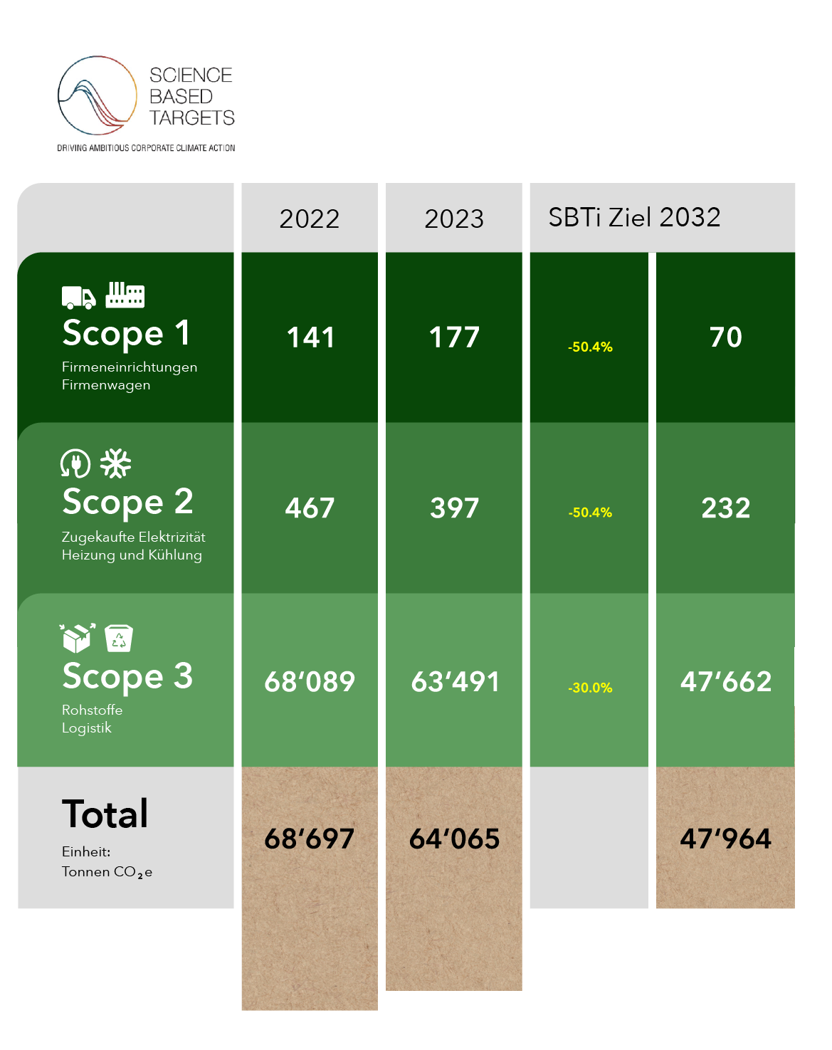 SBTi hat das große Ziel, den globalen Temperaturanstieg auf 1,5 °C über dem vorindustriellen Niveau zu begrenzen. Wir verpflichten uns, unseren Fußabdruck bis 2050 auf Netto-Null-Standard zu bringen. Zudem verpflichten wir uns bis 2032 die Scope-1- und Scope-2-Emissionen (u.a. betriebliche Einrichtungen, Firmenfahrzeuge, zugekaufter Strom, Heizung und Kühlung) um 50,4% und die Scope-3-Emissionen (u.a. Rohmaterial, Logistik, Entsorgung verkaufter Produkte) um 30% zu senken.